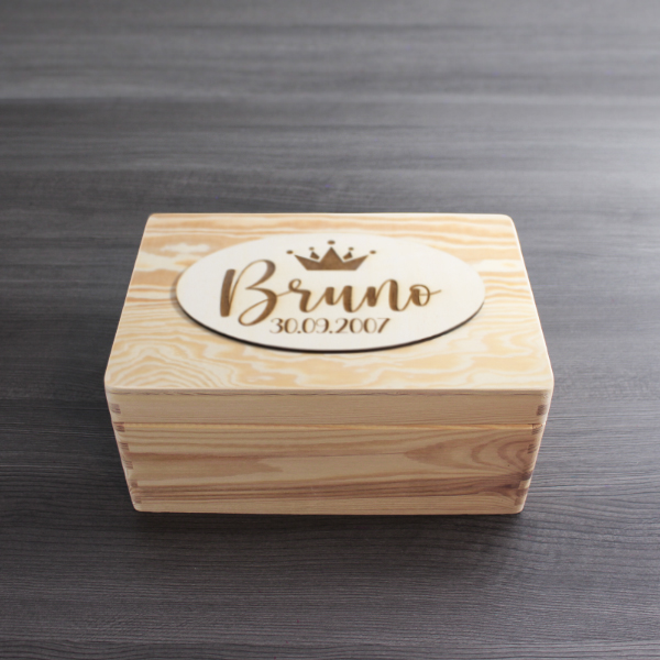 " NAME + DATE " - wooden box - BRUNO STYLE - Size S - approx. 30 x 20 x 14 cm | VARIANT 2